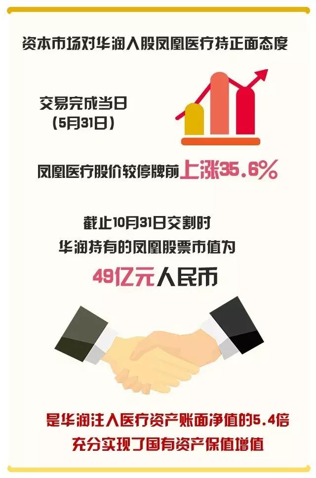 混合所有制的目標(biāo)是啥?是促進(jìn)國有企業(yè)轉(zhuǎn)換經(jīng)營機制,放大國有資本功能。華潤控股整合鳳凰醫(yī)療、中信醫(yī)療,增強國有資本對上市公司的主導(dǎo)力度,以11億國有資本(華潤累計投入的資本)撬動約88億元的社會資本,擴大了上市公司的產(chǎn)業(yè)規(guī)模和全國布局。